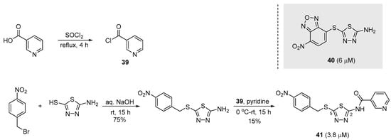 The Olsson group identified a new class of inhibitors against S. aureus sortase A []. Through small-molecule libraries screening and PAINS (pan-assay interference compounds) study, top hit structures emerged. The hit compound 40 was selected as the starting point for structural hit-to-lead optimization. A series of modifications of 40 commenced with the removal of the oxadiazole unit which has been shown to cause cytotoxicity. Synthetic modifications included elongation of the sulfide substituent and addition of various substituted benzyl derivatives to validate some electronic effects. After all, N-(5-((4-nitrobenzyl)thio)-1,3,4-thiadiazol-2-yl)nicotinamide 41 (IC50 = 3.8 μM) was identified as a potent inhibitor of sortase A. As illustrated in Scheme 10, 5-amino-1,3,4-thiadiazole-2-thiol was reacted with the appropriate bromide under basic conditions, affording the desired products in good yields. The primary amine was acylated, which was achieved upon treatment with nicotinoyl chloride 39 that was induced from nicotinic acid in situ [,,].