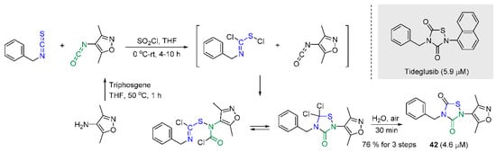 In an attempt to discover innovative scaffolds for sortase A inhibitors, the S. Yang and C.-G Yang research groups employed FRET-based HTS on a library consisting of over 2400 clinical drugs and candidates []. Tideglusib (TD), a drug candidate for myotonic dystrophy [], was identified as a hit structure with an IC50 value of 5.9 μM. The authors prepared 40 sorts of TD analogs which were constructed with a thiadiazolidinedione skeleton and analyzed their structure–activity relationships for sortase A inhibition. Several molecules were explored, changing two N-substitutions with a variety of functionalities [], and it was observed that the most promising compound, 42, bears 3,5-dimethylisoxazole substituent, retains inhibitory activities compared to that of TD, shows better solubility, and minimally inhibits the growth of the S. aureus. When it comes to the preparation of TD analogs, a concise synthetic route illustrated in Scheme 11 was adopted. The reaction system with an isothiocyanate, an isocyanate, and same equivalent molar amount of sulfuryl chloride (SO2Cl2) even generated the unstable S-chloroisothiocarbamoyl chloride, and via the assembly with chloro-intermediates, the desired scaffold was established with good conversion efficiency.