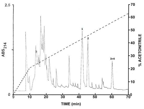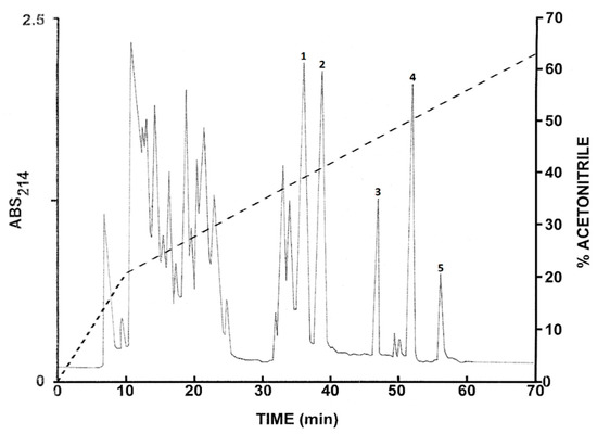 The peaks designated 1–5 in Figure 1 and 1–4 in Figure 2 were shown to contain components with molecular masses in the range of 1–4 kDa by MALDI-TOF mass spectrometry. These peptides were purified to near homogeneity by successive chromatographies on (1.0 cm × 25 cm) Vydac 214TP510 (C-4), (1.0 cm × 25 cm) Vydac 219TP510 (dimethylphenyl), and (1.0 cm × 25 cm) Vydac 208TP510 (C-8) columns. For the more hydrophilic peptides (retention times < 35 min), the concentration of acetonitrile in the eluting solvent was raised from 14% to 42% (v/v) over 50 min and for the more hydrophobic peptides, from 21% to 56% (v/v) over 50 min. The flow rate was 2 mL/min.