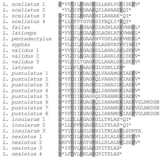 Sequence alignment of the ocellatin peptides from L. insularum and L. nesiotus with the orthologous peptides from other Leptodactylus species isolated to-date. Gaps denoted by (*) are introduced into certain sequences in order to maximize the structural similarity of the peptides. Shading is used to indicate the amino acid residues that have been very strongly conserved. a Denotes C-terminal α-amidation.