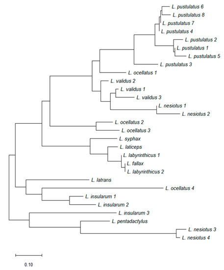 A phylogenetic tree generated using the neighbor-joining method with Poisson correction based upon the primary structures of the ocellatin peptides isolated from frogs belonging to the genus Leptodactylus that are shown in Figure 4.