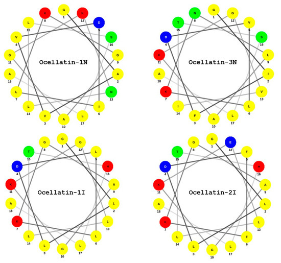 Schiffer–Edmundson wheel representation of the (1–18) regions of four of the ocellatins, isolated from L. insularum and L. nesiotus. Amino acid color code: Red—polar/basic (Lys, His); blue—polar/acid (Asp, Glu); green—polar/uncharged; and yellow—nonpolar/hydrophobic.