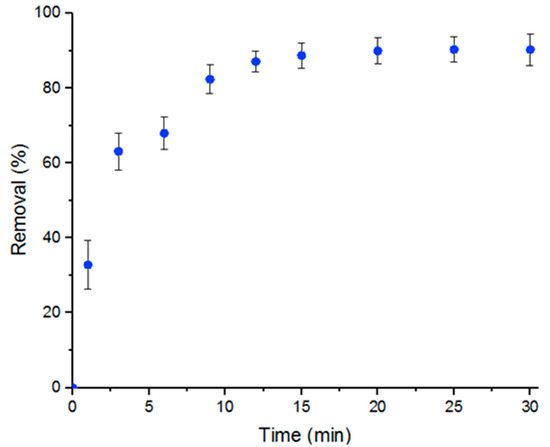 The main goal of the study is to demonstrate that MOFs, specifically UiO-66, achieve high efficiency in removing Doxycycline from water. The removal of Doxycycline by UiO-66 was studied in a batch reaction. The percent removal of Doxycycline with respect to time of reaction initiation, which was calculated according to Equation (3), was plotted as shown in Figure 1. Figure 1 shows a maximum percent removal of Doxycycline solution of nearly 100% after 15 min at room temperature and neutral pH conditions. Five mL of a 100-μM solution was used with 5 mg UiO-66.