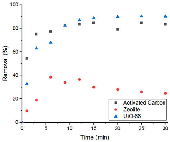 The aforementioned concerns of oxidation technologies have driven research towards finding alternative and more effective methods of antibiotic elimination. Of these methods are adsorption-based technologies that rely on the porosity of adsorbents to actively and capably remove contaminants from aqueous environments [11,12]. High selectivity, simple operating requirements and low manufacturing cost make these technologies more advantageous than those previously mentioned. Activated carbons, zeolites, multiwalled carbon nanotubes and metal-organic frameworks (MOFs) are examples of highly porous adsorbents that have been proven to successfully remove wastewater contaminants [12,13,14].