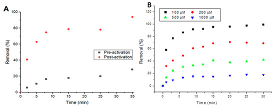 (A) Performance of metal-organic framework (MOF) pre- and post-activation with 100-μM solutions of Doxycycline and (B) Effect of solution concentration on percent removal.