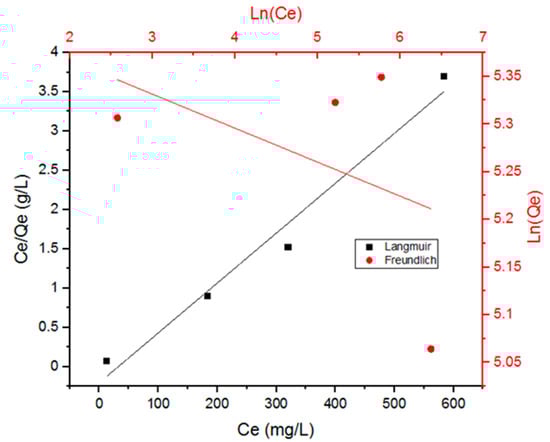 To characterize the adsorbate molecules’ distribution at different equilibrium concentrations in liquid phase, adsorption isotherms are used [7,22]. Furthermore, the nature of interaction between adsorbate molecules and the adsorbent can be better understood through fitting the adsorption data with adsorption models. The adsorption models that were used in this study were the linear-form Langmuir model and Freundlich model, shown in Equations (4) and (5), respectively [7,22]: