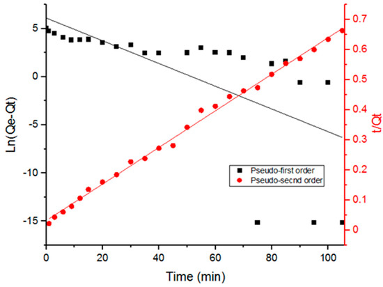 Adsorption kinetics data were analyzed (Figure 5) using two kinetic models: pseudo-first order and pseudo-second order in their linear forms as shown in Equations (6) and (7) [7,27,29]: