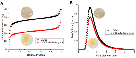 BET surface area measurements indicate that fresh UiO-66’s surface area is about 856 m2/g. Such large surface area is due to the adsorption of N2 molecules both on the surface of UiO-66 and within its pores. Figure 6A shows UiO-66 and Doxycycline-filled UiO-66 BET adsorption/desorption isotherms. Figure 6B shows the distribution of pore diameter of UiO-66 and Doxycycline-filled UiO-66 with respect to sample volume. The adsorption/desorption curves in Figure 6A are type II isotherms (as classified by IUPAC). Hysteresis loops were observed upon N2 desorption at high relative pressure, which are due to capillary condensation then evaporation. Figure 6B indicates that UiO-66 is microporous in majority (diameter < 2 nm) with a fraction of its volume being mesoporous (diameter > 2 nm). Upon the adsorption of Doxycycline, the UiO-66 surface area dropped to 669 m2/g, which is a 187-m2/g decrease in surface area (~27.9% decrease in surface area). Such a reduction in surface area is comparable and relatively higher than other reported porous adsorbents of Doxycycline. For example, PIM-1 was reported to have 60 m2/g reduction in surface area upon the adsorption of Doxycycline [7]. The adsorption/desorption isotherms in Figure 6A and the pore diameter distribution in Figure 6B both show a consistent behavior of the overall data for fresh UiO-66 adsorbing more volume and having more volume with respect to each pore diameter than the overall data for UiO-66 after adsorbing Doxycycline. This pattern is due to the effect that the adsorption of Doxycycline has on the internal free volume of UiO-66 (reduction in internal free volume).