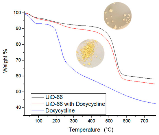 TGA data for fresh UiO-66, fresh Doxycycline, and Doxycycline-filled UiO-66. Images of Doxycycline loaded (bottom) and unloaded UiO-66 (top) are provided.