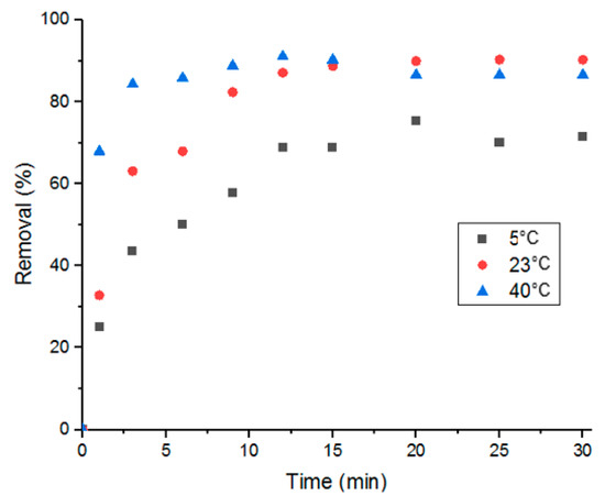 In this study, influence of the adsorption process’s temperature and determination of thermodynamic parameters were conducted at three different temperatures: 5, 25 and 40 °C. As shown in Figure 10, adsorption performance was better with solutions at room temperature and at 40 °C. And when comparing adsorption at room temperature to adsorption at 40 °C, it is evident that the higher the temperature, the faster the adsorption is. This stems from the effect that heat has on diffusion; elevated temperatures promote faster molecular diffusion.