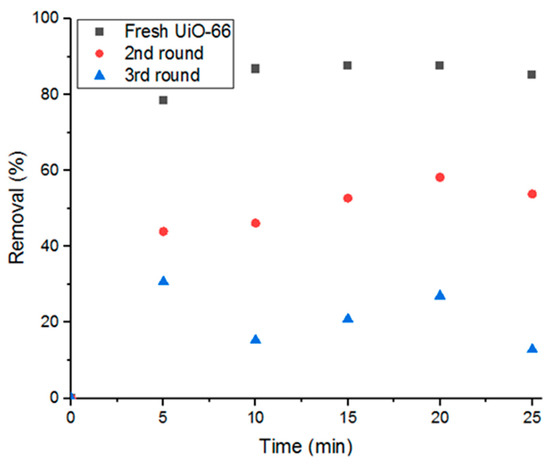 The third recycling method investigated is moderate heat (evaporation) under vacuum for 10 min at elevated temperature (75 °C and ~300 torr). With this recycling method, the average decrease in percent removal of Doxycycline dropped to 9.61%, which is lower than all previous recycling methods (shown in Figure 13B). Such a low decrease in removal efficiency can be attributed to the combination of chemical decomposition of Doxycycline by elevated temperatures, elimination of the electrostatic forces and other chemical bonds that keep Doxycycline molecules bound to UiO-66’s structure, and physical dissociation of Doxycycline from UiO-66 by low-pressure force. This method is more advantageous than the previously tested methods as it recycles more efficiently in less time. Although all examined methods could not fully reactivate the adsorption property of UiO-66, they are still more economically and environmentally beneficial to consider for recycling adsorbents, even partially, to minimize treatment cost and waste production.