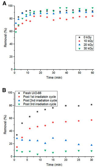 (A) Percent removal of Doxycycline with irradiated MOF (different gamma-ray dosages) and (B) Percent removal with irradiation cycles.