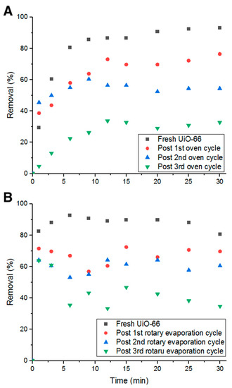 Heating in an oven for 24 h at 80 °C between each adsorption cycle was investigated. As inferred from Figure 13A, the decrease in percent removal dropped to 20%. This could be due to the effect heat has on Doxycycline. As heat decomposes the antibiotic (confirmed by UV-Vis measurements), pores are freed up for the cycles to follow. Additionally, after 24 h of heat, water content is completely eliminated, which could play a role in the removal and detachment of Doxycycline from the structure of UiO-66 due to the absence of electrostatic forces with the evaporation of water molecules from the adsorption medium.