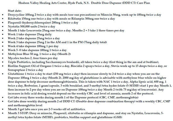 These three patients represent a snapshot of the effects of DDD CT therapy. In order to demonstrate the potential for this treatment to improve long-term tick-borne symptoms, we completed a retrospective chart review of an additional 37 patients for a total of 40 patients. The regimen was offered to approximately 100 patients, and we chose 40 patients who had completed the protocol at least 1 year prior in order to evaluate their remission and improvement status. All of the patients in this chart review had been ill for at least 1 year and had been treated by multiple health-care providers, failing traditional antibiotic therapy for Lyme disease, which included but was not limited to tetracyclines, macrolides, penicillins, and cephalosporins. Patients were given a standardized protocol sheet after determining eligibility. The DDD CT care plan is shown in Figure 1.