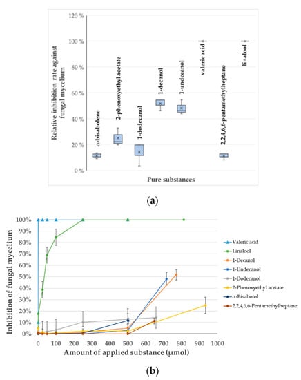 - Kai, M.; Effmert, U.; Berg, G.; Piechulla, B. Volatiles of bacterial antagonists inhibit mycelial growth of the plant pathogen Rhizoctonia solani. Arch. Microbiol. 2007, 187, 351–360. [Google Scholar] [CrossRef] [PubMed]