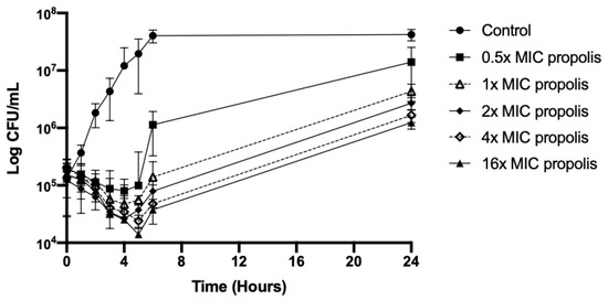 2.2. Time–Kill Curves of Propolis and Antibiotics Alone