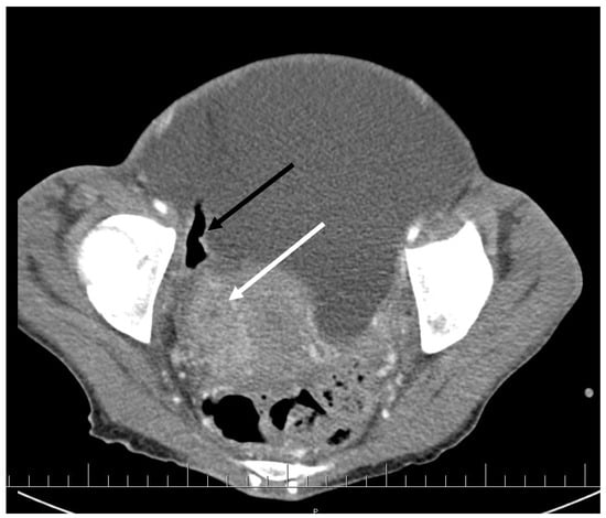 Pelvic CT scan shows ascites, enlarged right ovary (white arrow) and a gas-containing non-homogenous mass adhering to the uterus (black arrow).