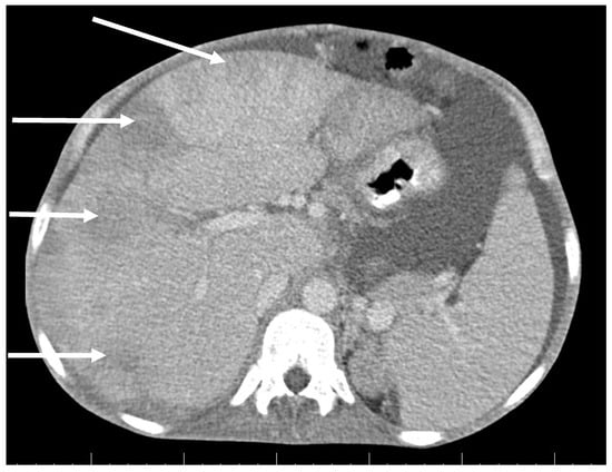 Abdominal CT scan shows multiple lesions in the liver (arrows).