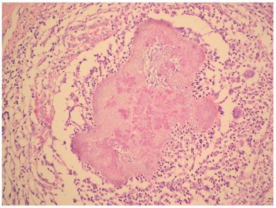 Histopathology shows granuloma with purulent exudate and actinomycotic granules. Haematoxylin–eosin stain. (With kind permission of Dr. Kamila Benková, Department of Pathology, Hospital Na Bulovce.).