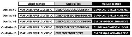 The five new ocellatins identified herein belong to the group of shortest ocellatins. They present 21 residues and a +2 net charge for ocellatin-7, -8, -9, and -10 and +1 for ocellatin-11. All of these compounds have Asp4, Lys7, Lys11, Glu19, and Lys20, whereas Asp8 and His16 are present in four of the five peptides. Translation of the nucleotide sequences of the prepro-peptides revealed the presence of a Gly residue at their C-terminal end. This residue represents a signal for C-terminus amidation during the posttranslational maduration process of the peptides. C-terminus amidation is common in natural AMPs, where a difference of approximately 1u is observed between the theoretical and experimental molecular masses according to the amino acid sequence [18,47]. All ocellatins are amidated at the C-terminus. Only the longer ocellatins present an acidic C-terminus (ocellatin-PT6, -PT7 and -PT8). C-terminus amidation is essential for the biological activity of many neuropeptides and hormones [48]. Several studies have proposed that C-terminus amidation confers enhanced antimicrobial activity compared with analogs with an acidic C-terminus, although this effect is not universal [49,50].