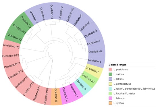 It is noteworthy that the peptides from L. vastus, L. fallax, L. labyrinticus, L. knudseni, and L. pentadactylus are grouped, thereby validating the common origin perceived in the phylogram, and the same was observed for L. pustullatus and L. validus. All the new peptides identified from L. latrans in this work are segregated, together with four of the six ocellatins previously described in specimens of the same species. Ocellatin-10 and -6 form one cluster; ocellatin-9, -7, -8, and -5 form another sister cluster, and ocellatin-11, -2, and -3 are in a third cluster.