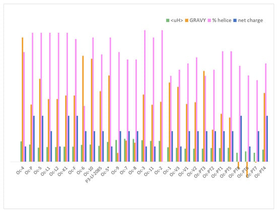 To interact with negative density charged bacterial membranes not only must the peptide have a positive net charge but also a high hydrophobic content, at least 50%, and an amphipathic arrangement. The GRAVY value is a useful index to evaluate hydrophobicity. It is calculated by adding the hydropathy values [58] of each amino acid residue and dividing by the number of residues in the sequence. A higher positive score indicates increased hydrophobicity. Figure 4 shows the extensive variability of hydrophobicity among ocellatins, which GRAVY values range between −0.103 and 0.81, the aggregation value also being variable (Figure S5B,C). The ocellaltin-10 described by our group is among the most hydrophobic ocellatins (together with ocellatin-4, -5, and -6), while the novel ocellatin-7, -8, and -9 are the least hydrophobic. Ocellatin-PT6, -PT7, and -PT8 are the only hydrophilic peptides in the ocellatin family (Figure 4).