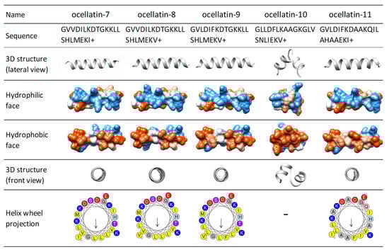 The arrangement plays a significant role in the balance between charged and hydrophobic amino acids. It should be amphipathic, with a hydrophilic side and an opposite hydrophobic side in the projection of the helical wheel. The amphipathic helix improves activity and selectivity, although some studies have observed that an imperfect amphipathicity provides certain benefits [59]. The hydrophobic moment is a measure of the amphipathicity of a helix. Each amino acid side chain is assigned a positive or negative value on the basis of its hydrophobicity. These values are used to weight vectors for each residue as they are displayed around the helix [60,61]. Ocellatin peptides show variable hydrophobic moments (between 0.6–1.49) (Kyte-Doolittle scale), with values that indicate amphipathic helical structures. The Schiffer and Edmundson wheel projection diagram allows visualization of the arrangement of amino acids in α-helix type structures. Figure S8 shows the wheel projections of all ocellatins that have a single-α-helix theoretical 3D. Among the single-α-helix structured ocellatins, although the newly identified ocellatin-9, -7, -8, and -11 are the least hydrophobic, they present the highest hydrophobic moments (Figure 5 and Figure S4A,B).