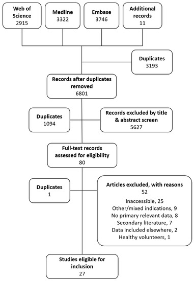 Deduplication was performed using Endnote (version X8.0.1). Title and abstract screening was performed independently by two authors (AS, SdS), with discrepancies resolved by a third author (JDJ). Full-text screening was performed independently by two authors (AS, JDJ), with discrepancies resolved by a third author (HJS). This review was conducted in accordance with the PRISMA (Preferred Reporting Items for Systematic Reviews and Meta-Analyses) guidelines [41] and a PRISMA checklist completed (Supplementary File S1).