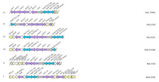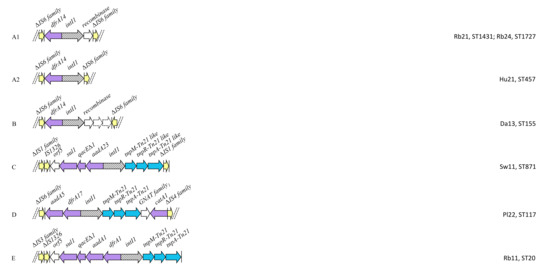 - Dhanji, H.; Doumith, M.; Hope, R.; Livermore, D.M.; Woodford, N. IS Ecp1-mediated transposition of linked bla CTX-M-3 and bla TEM-1b from the IncI1 plasmid pEK204 found in clinical isolates of Escherichia coli from Belfast, UK. J. Antimicrob. Chemother. 2011, 66, 2263–2265. [Google Scholar] [CrossRef]
