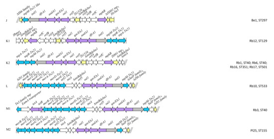 - Partridge, S.R.; Kwong, S.M.; Firth, N.; Jensen, S.O. Mobile Genetic Elements Associated with Antimicrobial Resistance. Clin. Microbiol. Rev. 2018, 31, e00088-17. [Google Scholar] [CrossRef] [PubMed]
