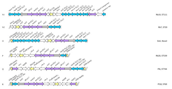 - Reid, C.J.; Chowdhury, P.R.; Djordjevic, S.P. Tn6026 and Tn6029 are found in complex resistance regions mobilised by diverse plasmids and chromosomal islands in multiple antibiotic resistant Enterobacteriaceae. Plasmid 2015, 80, 127–137. [Google Scholar] [CrossRef]