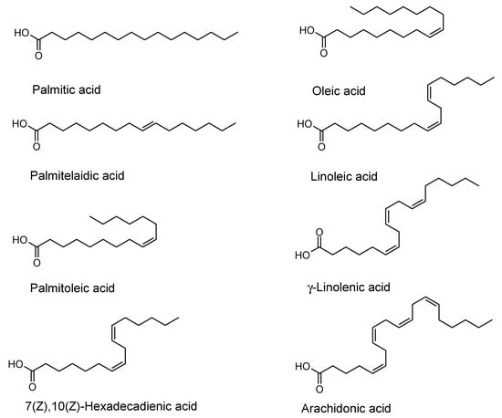 Fatty acids tested range from the C16-fatty acids palmitic, palmitelaidic, palmitoleic and 7(Z),10(Z)-hexadecadienic acid, and the C18-fatty acids oleic, linoleic and γ-linolenic acid to the C20-fatty acid arachidonic acid.