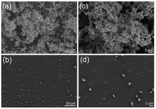 Field emission scanning electron microscopic (FESEM) images at different magnification steps (b) and (d) of Staphylococcus aureus biofilms treated with 64 µg mL−1 γ-linolenic acid (64 µg mL−1) compared to the negative control (a,c). Scale bar for (a) and (b) is 20 µm, for (c) and (d) it is 2 µm. Please note that in order to get a larger area covered with biofilm, 8-well plates were used here instead of the 96-well plates used for the determination of antibiofilm activities.