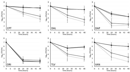 - Mascio, C.T.M.; Alder, J.D.; Silverman, J.A. Bactericidal action of daptomycin against stationary-phase and nondividing Staphylococcus aureus cells. Antimicrob. Agents Chemother. 2007, 51, 4255–4260. [Google Scholar] [CrossRef] [PubMed]
