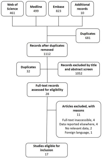 Title and abstract screening revealed a further 32 duplicate records and led to the exclusion of 1052 records that did not meet the inclusion criteria (Figure 1). Of the remaining 28 articles eligible for full-text screening, 11 were excluded because they could not be accessed in full (n = 4), contained data reported by a paper already included (n = 4), contained no relevant data (n = 2) or were not available in English (n = 1).