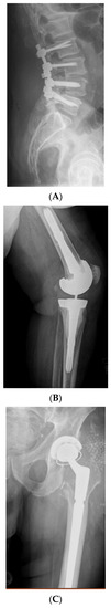 Examples of a few types of “hardware” that once infected require removal for definitive cure of these biofilm infections. (A) A lumbar posterior spinal rods and pedicle screw construct. (B) Total knee arthroplasty with long stem femoral and tibial components. (C) Total hip arthroplasty.