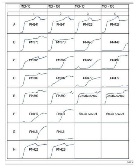 Figure 2. Bacterial growth inhibition curves or “Phagogram” for a compassionate use Staphylococcus epidermidis case in a recalcitrant prosthetic joint infection. Different bacteriophages are indicated by PM241-PM472. MOI refers to multiplicity of infection. Growth control is the bacterial isolate with no bacteriophages. Each box has time on the x-axis from 0 to 48 h. This figure shows how growth inhibition testing is conducted to determine potential bacteriophage candidates (PM448, PM472, and PM421). This figure also shows how different MOIs can cause different growth inhibition durations as seen with bacteriophages: PM448, PM472, and PM421. - (2)