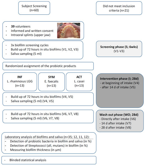 The observer-blind, parallel, randomized clinical trial took place at the Department of Periodontology and Peri-Implant Diseases of the Philipps-University, Marburg, Germany. It was approved by the Medical Ethics Committee of Philipps University (no. 44/11) and conducted in accordance with the ICH, Good Clinical Practice guidelines, and the Declaration of Helsinki (1964). The clinical trial was registered as ‘DRKS 00017822’. Sixty potential participants took part in an initial screening visit to assess their eligibility; the main inclusion criterion was a DMFT (number of decayed, missing, and/or filled teeth) of 0–5, corresponding to low caries experience. Patients had to be over 18 years of age, in good health, without any allergies to the products used in the study and had to be non-smokers (less than five cigarettes per day). They received participant information and signed an informed consent form. Exclusion criteria were any systemic diseases, smoking, untreated periodontal disease with signs of destructive periodontitis or inflammatory symptoms, caries, systemic antibiotic therapy within the last 6 months, a history of probiotic intake, or pregnancy. Furthermore, the use of any of the following drugs within the last 6 months: oral, intravenous, intramuscular, nasal or inhaled corticosteroids, and/or a history of viral infection (i.e., HBV, HCV, HIV) was excluded. In the end, 39 participants (aged 18–32 years) were included. A flow chart of the study is presented in Figure 1.