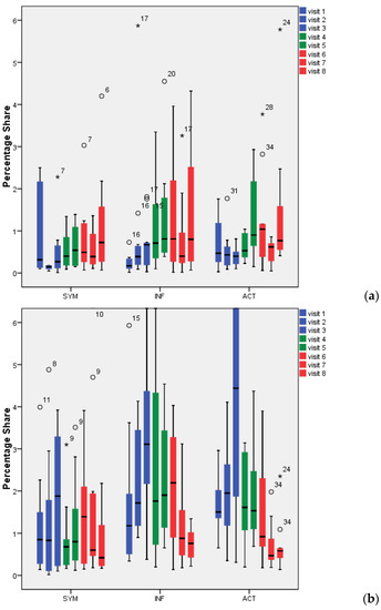 Saliva (Figure 2b) showed somewhat higher percentages of bacteria than biofilm (Figure 2a). Lactobacillus spp. were found at values of up to 4.5% (with the exception of V3 in ACT: 6.5%). While for the SYM group, no differences could be found between any of the visits (V4–V8) compared to baseline screening (p > 0.05), the ACT group revealed significant reductions in lactobacilli counts during visits 6, 7, and 8 (p = 0.034, 0.003, 0.003) and the INF group during visits 7 and 8 (p = 0.10, 0.002). Proof of the bacteria’s conformity during screening showed no match to the bacteria supplied. No significant differences could be found when the different groups were compared (p > 0.05).