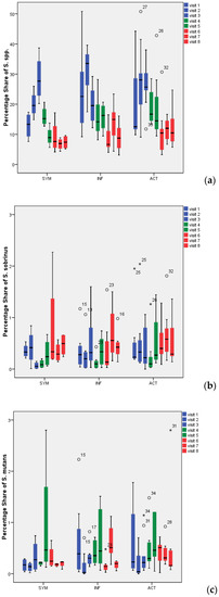 Percentage of all Streptococcus spp. (a), Streptococcus sobrinus (b), and Streptococcus mutans (c) in 72-h dental biofilm. °: Outliers with values between 1.5 and 3 times the interquartile range (IQR) above the 75%-quantile (Q3) (Q3 + 1.5 × IQR ≤ value ≤ Q3 + 3 × IQR); *: Extremes with values more than 3 times the IQR higher than Q3 (value > Q3 + 3 × IQR).