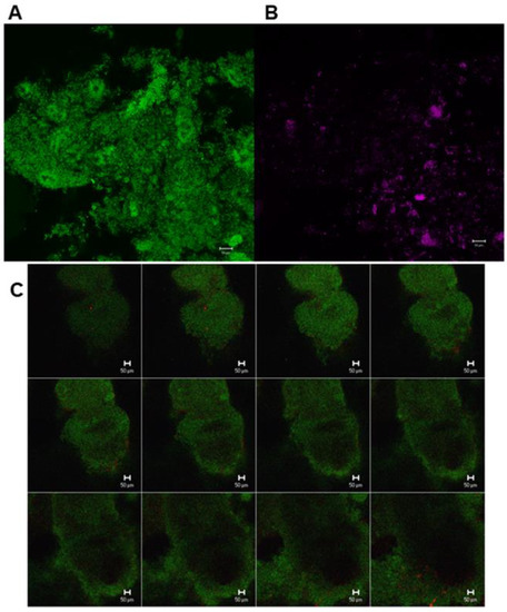 Confocal laser scanning microscopic (CLSM) images from different sections of in situ oral biofilm after the application of fluorescent in situ hybridization with different specific probes. (A) Green, eubacteria-specific; (B) Streptococcus spp.-specific probe; (C) Z-section galleries of representative CLSM images depicting a 3-day old biofilm hybridized with eubacteria-specific (green) and Lactobacillus spp.-specific probe (red).