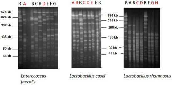 Pulsed-field gel electrophoresis (PFGE) patterns of E. faecalis, L. casei, and L. rhamnosus strains isolated from the supragingival biofilm of the different subjects. Red letters show the strains that were isolated from volunteers and genetically identical to the probiotic product strain. SYM strain: Lane A, ACT strain: Lane B, IINF strain: Lane H. Lane R above the PFGE indicates the reference strain Staphylococcus aureus NCTC 8325.