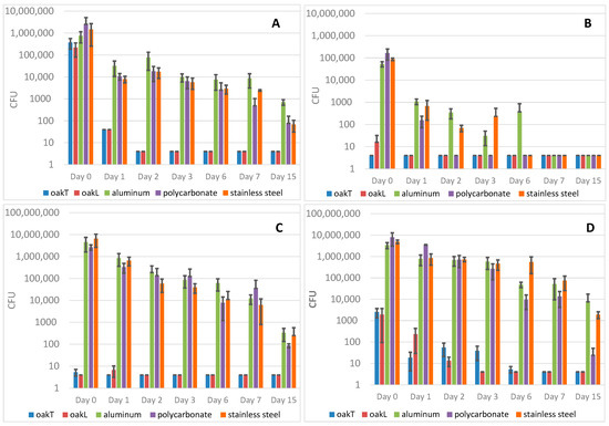 Average Colony Forming Units (CFU) of Klebsiella pneumoniae ATCC 700603 (A), Acinetobacter baumannii ATCC 19606 (B), Enterococcus faecalis ATCC 51299 (C) and Staphylococcus aureus KSKS7326 (D) on five materials. Blue bars represent transversal oak, orange bars represent tangential oak, grey bars represent aluminum, yellow bar represent polycarbonate and green bars represent stainless steel. The black lines represent the standard deviation (SD). y axis: bacterial CFU. x axis: day of determination of the viable counts.
