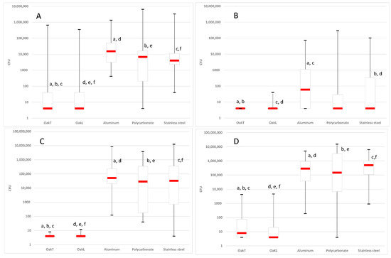 Box plot representing viable bacteria count distribution (from day 0 to day 15) for Klebsiella pneumoniae ATCC 700603 (A) with significant differences reported according to Dunn’s Multiple Comparison Test: (a) oakT vs. aluminum p ≤ 0.001; (b) oakT vs. polycarbonate p ≤ 0.01; (c) oakT vs. stainless steel p ≤ 0.001; (d) oakL vs. aluminum p ≤ 0.001; (e) oakL vs. polycarbonate p ≤ 0.01; (f) oakL vs. stainless steel p ≤ 0.001, Acinetobacter baumannii ATCC 19606 (B) with significant differences reported according to Dunn’s Multiple Comparison Test: (a) oakT vs. aluminum p ≤ 0.001; (b) oakT vs. stainless steel p ≤ 0.01; (c) oakL vs. aluminum p ≤ 0.001; (d) oakL vs. stainless steel p ≤ 0.05 (C) with significant differences reported according to Dunn’s Multiple Comparison Test: (a) oakT vs. aluminum p ≤ 0.001; (b) oakT vs. polycarbonate p ≤ 0.001; (c) oakT vs. stainless steel p ≤ 0.001; (d) oakL vs. aluminum p ≤ 0.001; (e) oakL vs. polycarbonate p ≤ 0.001; (f) oakL vs. stainless steel p ≤ 0.001, and Staphylococcus aureus KSKS7326 (D) with significant differences reported according to Dunn’s Multiple Comparison Test: (a) oakT vs aluminum p ≤ 0.001; (b) oakT vs. polycarbonate p ≤ 0.001; (c) oakT vs. stainless steel p ≤ 0.001; (d) oakL vs. aluminum p ≤ 0.001; (e) oakL vs. polycarbonate p ≤ 0.001; (f) oakL vs. stainless steel p ≤ 0.001 on five materials. y axis: bacterial CFU.