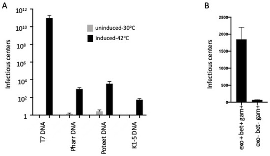 2.2. T7 Transfection Requires the Exo and Bet Gene Functions and Is Independent of the Host RecA Function