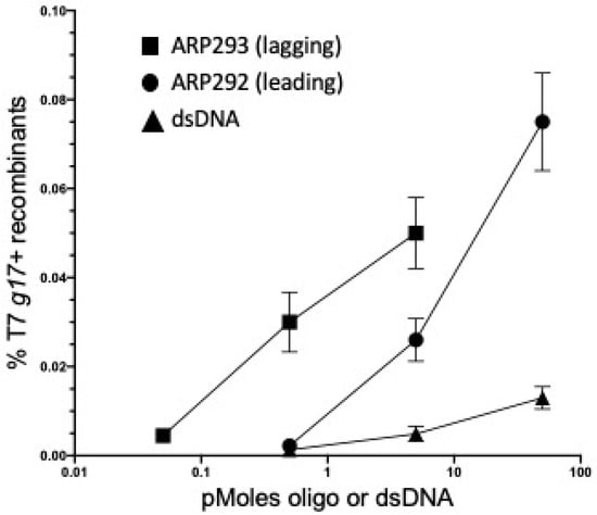 Recombineering corrects a point mutation after infection by a T7 phage particle. The lagging strand single-strand oligonucleotide (ARP293) of 71 nucleotides in length was used as a substrate during recombineering to correct the phage mutation T7 g17am267. The amber suppressor strain ARP3771 was infected with the T7 g17am267 mutant phage at a multiplicity of infection of ~5 phage per bacterium. Cells were either induced to express Red function and then electroporated with the leading and lagging strand oligonucleotides ARP292 and ARP293 at several oligo concentrations (see x-axis). Electroporation reactions were outgrown at 37 °C in SOC media until lysis. Frequency of T7 g17+ recombinants (y-axis) was calculated by the following equation: (recombinant phage titer on E. coli B)/(total phage titer on E. coli B40 supD). Values represent an average of at least three biological replicates. Lysates, in which no lagging strand oligo DNA was added, revealed a reversion frequency of ~1.1 × 10−6 (±4.1 × 10−7).