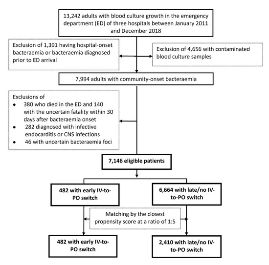 During the study period, patients with blood cultures sampled in the ED were screened for clinically significant bacteraemia using a computer database. Focusing on all medical and surgical encounters with blood culture growth, clinical information was retrieved by reviewing medical charts. Adult patients were excluded if they had contaminated blood cultures or if they were transferred from other hospitals. Among patients with multiple bacteraemic episodes, only the first episode was taken into account. Of the remaining patients within the study endpoint, those with evidence of long courses of IV antimicrobial therapy (i.e., central nervous system infections or infective endocarditis), those that died in the ED, those with uncertain fatality within 30 days after arrival in the ED, and those with incomplete clinical information (such as uncertain bacteraemic foci) were excluded. Of the eligible patients, those who remained on IV antimicrobial therapy after hospitalisation through the ED were regarded as the group of late/no IV-to-PO switch, whereas those that were switched to oral antibiotics from initial IV antimicrobial administration in the ED and then directly discharged from the ED and accepted regular outpatient clinic visits were categorised as the group of early IV-to-PO switch.