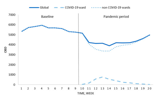 Changes in occupied bed days (OBD) before the national lockdown (baseline) and the pandemic period.
