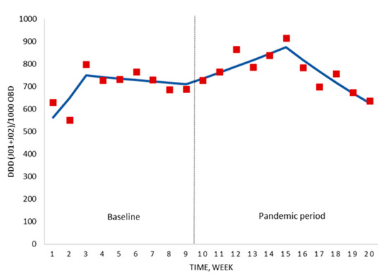 Analysing the results over the course of the COVID-19 pandemic (weeks 10–20), the antimicrobial consumption showed an increase of +3.5% per week (p = 0.016) from the beginning until week 15 (six weeks after national lockdown). From this date until the end of the study period, a sustained weekly reduction of −6.4% (p = 0.001) was observed (Figure 2; Table S1). The global trend for the whole study period was stable (+0.6% weekly change; p = 0.614).