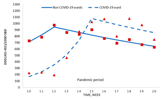 Nevertheless, during the last five weeks of the period, the COVID-19 ward experienced high consumption values compared to those observed in the previous weeks. This fact could be explained by the presence of patients with severe disease, long hospital stays, and hospital-acquired infections. This phenomenon has been proposed by other authors in previous studies [23,28].
